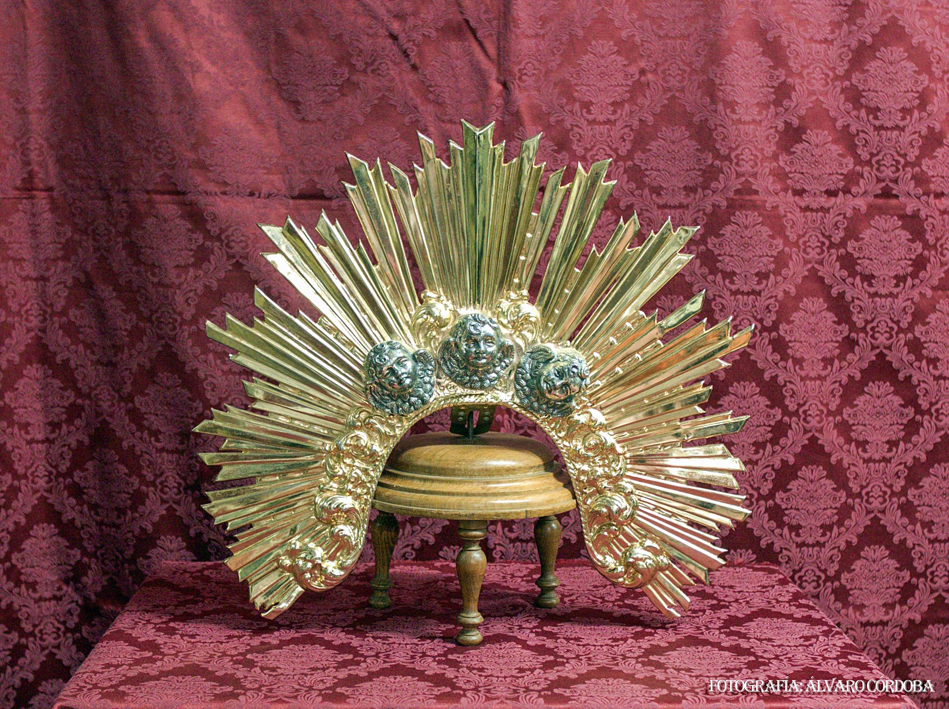 Descripción: Diadema en plata de ley. Presenta un resplandor dorado con rayos biselados y tres querubines plateados.